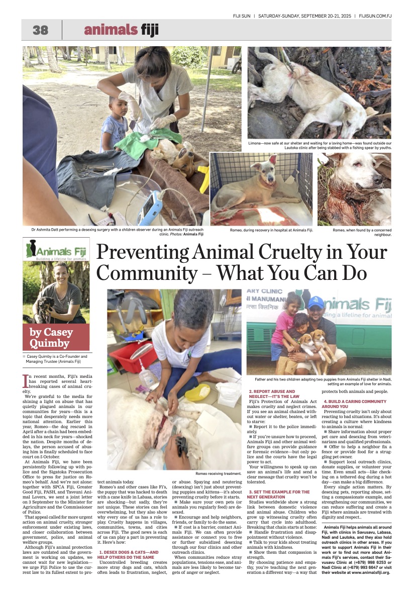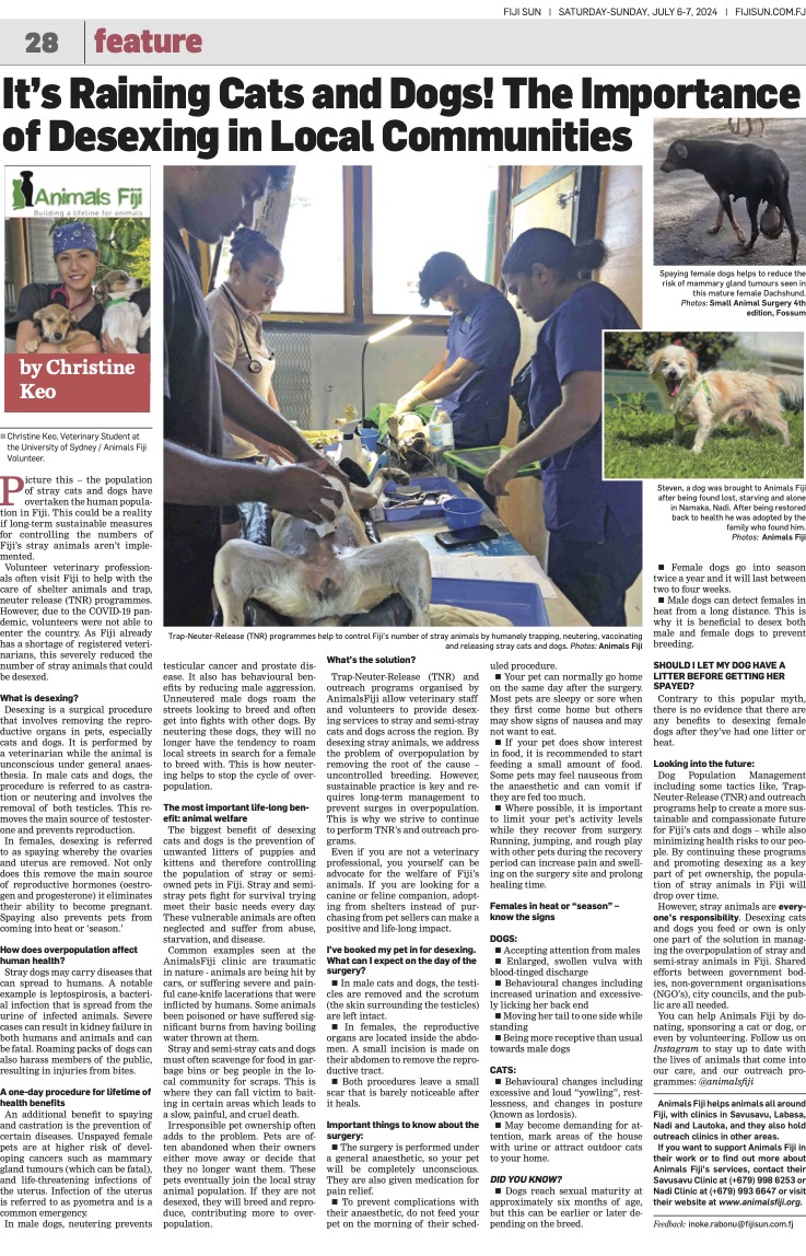 Each week we provide a column to the Fiji Sun for thier Saturday edition to help bring awareness and education about topics of animal welfare. Here you can find a digital copy of each article and the variety of topics we have covered, like Hoof Care for Horses, Goat Care, Cat Behaviour, TVT in dogs, and much more.