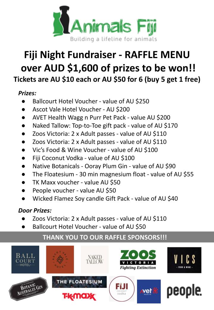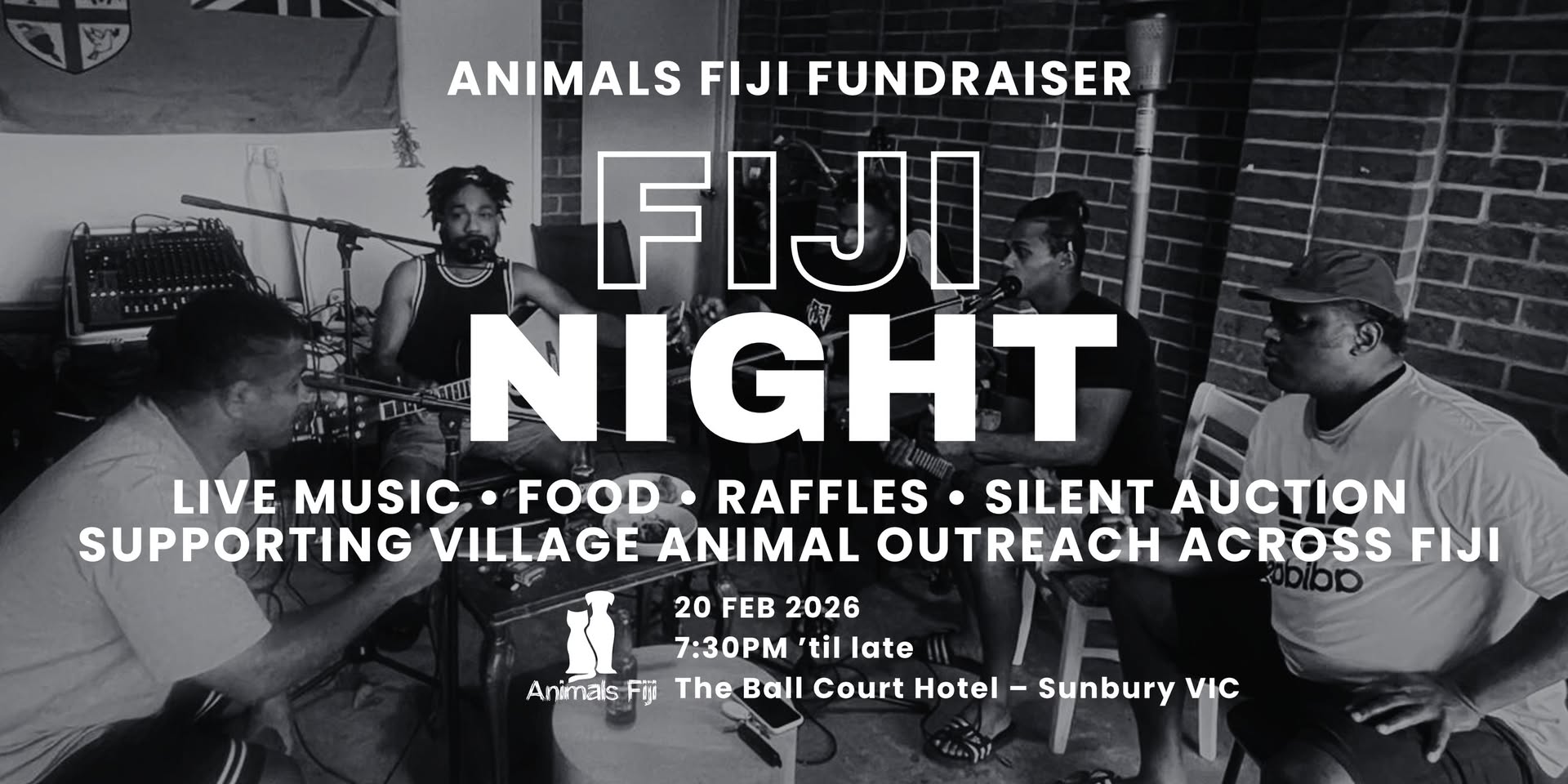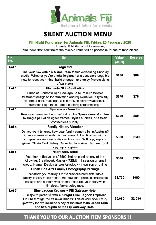 All proceeds go directly to Animals Fiji, supporting village outreach veterinary clinics across Fiji.